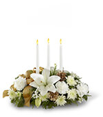 The Glowing Elegance Centerpiece brings a warm sophistication to your holiday table with each snow-kissed bloom. White roses, spray roses, carnations, mini carnations and baby's breath are beautifully arranged amongst an assortment of lush holiday greens to create an incredible winter holiday displa [...]